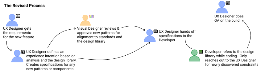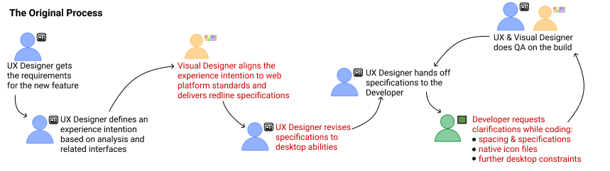 I reviewed the delivery process with the Visual Designers, previous UX Designers who had worked on parts of the application, and the developers themselves, and surmised that there were 4 underlying issues that needed to be addressed.